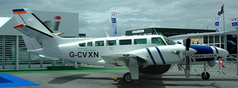 Nella foto: Cessna (Reims) F 406 Vigilant G-CVXN (n/c F406-0064 del 1991) dalla Caledonian Airborne Systems in mostra statica al salone di Le Bourget 2011. Questo aereo è propulso da due motori a turbina Pratt & Whitney PT6A-11 e dotato di radome ventrale con radar BAE Systems Seaspray 2000. Fu consegnato inizialmente alla Scottish Fisheries l'11 novembre 1991 che lo utilizzò fino al 2008. Da notare gli impennaggi del Citation.(Aeromedia)