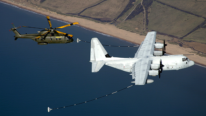 February 13, 2008. An aerial refuelling test between an AgustaWestland Merlin Mk3 helicopter of the RAF and an Italian Air Force Lockheed Martin C-130J tanker. (AgustaWestland)