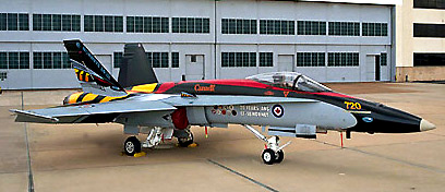 Dipinto con una vistosa colorazione speciale, un F/A-18 Hornet canadese, o CF-18 come è denominato in quel paese, ha fatto visita allo stabilimento Boeing di St. Louis, il nido degli Hornet, in occasione del 20° anniversario della sua entrata in servizio in Canada.