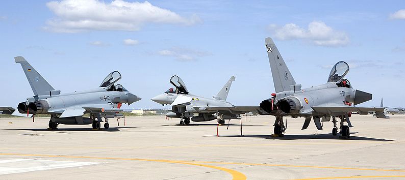 In total, 20 Eurofighter Typhoon aircraft take part in the exercise: the German Air Force deployed three aircraft from Fighter Wing 73 “Steinhoff” from Rostock-Laage; Italy’s Gruppo XII 36 Stormo, based at Gioia del Colle, and Gruppo IX 4 Stormo, at Grosseto, both sent two aircraft; a total of four weapon systems came out of the Royal Air Force’s No.3 and 11 Squadrons from RAF Coningsby; with the remaining nine already stationed at Morón as part of the Ejército del Aire’s Grupo de Caza 11 Ala 11.