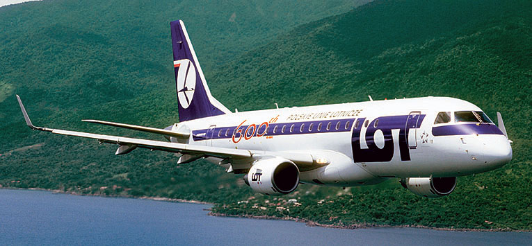 Embraer ERJ-175 SP-LII for LOT Polish Airlines, during a pre-delivery flight. It is the 600th e-jet manufactured by the Brazilian company. The aircraft has been delivered on September 15, 2009, wearing on the fuselage the number "600" in red colour. (Embraer)