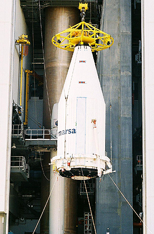 Inmarsat 4-F1, an Eurostar E3000 satellite type manufactured by EADS Astrium, is lifted (inside its fairing) aboard the Atlat V launcher. With a weight of nearly 6 metric tons, it is one of largest commercial communications satellites in the world. (ILS)