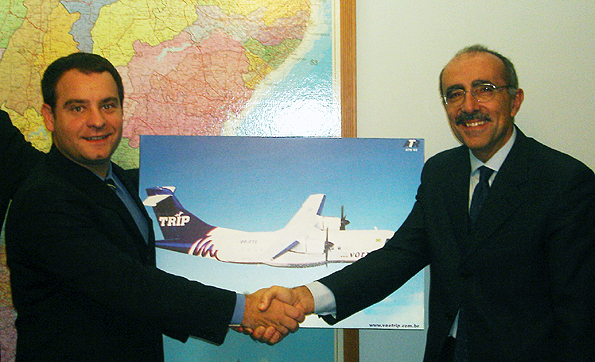 José Mario Caprioli Dos Santos, TRIP Linhas Aereas CEO, and Filippo Bagnato, ATR CEO, after the signature of the contract for seven ATR 72-500 aircraft. (ATR)