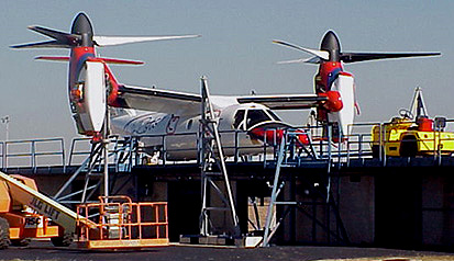 With its rotors in the horizontal position, the first prototype of the Bell/Agusta BA 609 tiltrotor on the ground run test stand for the first engine run, December 5, 2002. (Bell/Agusta)