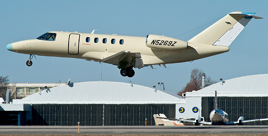 (NdR: piccolo mistero: in occasione del roll-out, il primo Citation CJ4 di serie era immatricolato N52141. Adesso, al primo volo, le marche sono diventate N5269Z.)