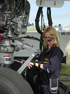 Ecco come si usano i manuali elettronici: computer alla cintura, touch-screen display al braccio e visore monocolare. (Xybernaut)