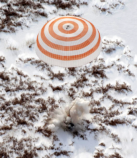 The Soyuz TMA-16 spacecraft is seen as it lands with Expedition 22 Commander Jeff Williams and Flight Engineer Maxim Suraev near the town of Arkalyk, Kazakhstan on Thursday, March 18, 2010. NASA Astronaut Jeff Williams and Russian Cosmonaut Maxim Suraev are returning from six months onboard the International Space Station where they served as members of the Expedition 21 and 22 crews.