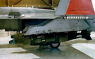 Boeing GBU-31 Joint Direct Attack Munitions, or JDAM bomb, under an U.S. Navy F/A-18 external pylon, before a test flight at China Lake test range, California. (USAF)
