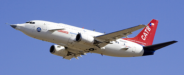 Cooperative Avionics Test Bed flies near Mojave, Calif., during a recent test. The modified B.737 N35LX, which will validate the F-35's avionics suite, met its initial test goals and is preparing to expand its flight envelope. February, 2007. (Lockheed Martin)