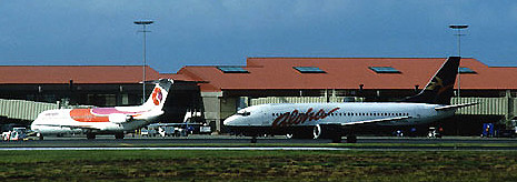 Kahului airport in the Maui island, Hawaii, with DC-9-51 of Hawaii Air and Aloha Airlines' B.737-300QC. (Aeromedia)