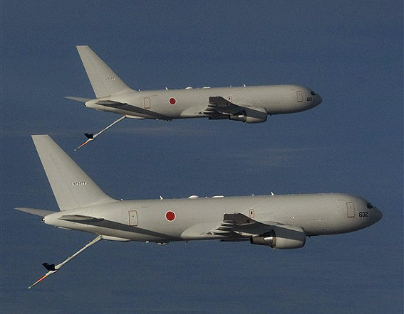 Boeing KC-767 for the JASDF “602” in formation flight with the first item, in the background. Both aircraft have the tail boom fully extended. (Boeing)