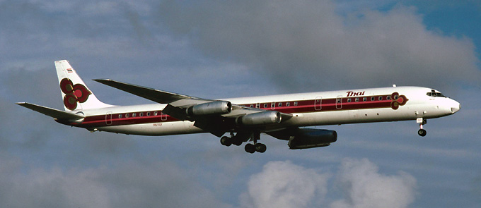 McDonnell Douglas DC-8-63 HS-TGY “Pathoomawadi” of Thai Airways (former SAS LN-MOY) lands at Rome/Fiumicino airport in January 1979. (Aeromedia)
