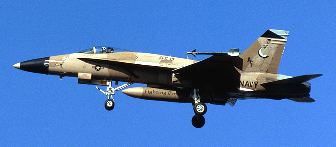 Boeing F/A-18C Hornet "12" of VFC-12, an U.S. Navy "Aggressor Squadron", lands at NAS Oceana in 2003. (Aeromedia)