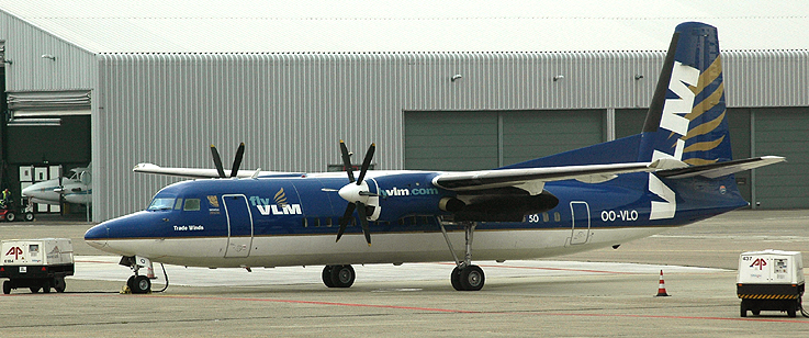 Fokker 50 OO-VLO “Trade Winds” of VLM Airlines parked on the apron of Rotterdam airport (2007). (Aeromedia)