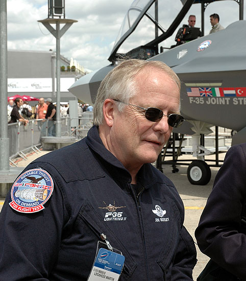 Jon Beesley, Lockheed Martin senior test pilot for the F-35 programme, talks with journalists during the 2007 Paris Air Show. (Aeromedia)