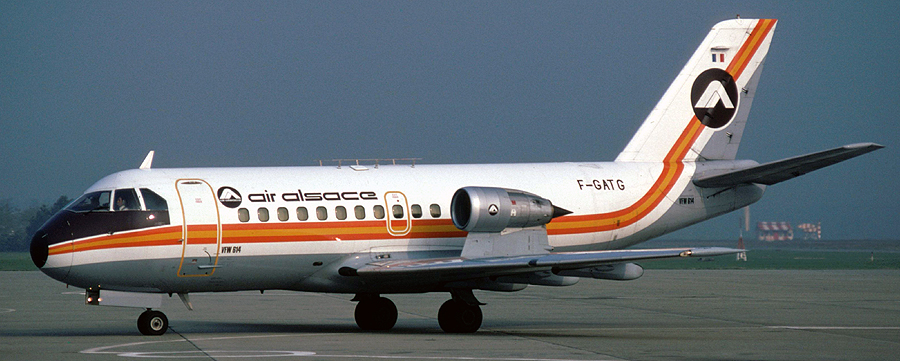 VFW 614-100 F-GATG of French airline Air Alsace taxiing at Turin/Caselle airport in November, 1978. The prototype of this German twin-turbofan short haul transport flew for the first time on July 14, 1971. Distinguished by its original engine arrangement with over-wing nacelles, VFW 614 is powered by two 34.5 kN (7.760 lb s.t., 3,520 kg s.t.) Rolls-Royce M.45H Mk501 turbofans. It accomodates 36-44 passengers, with a flight crew of two. Sixteen series aircraft were manufacured in Bremen and delivered to launch customer Cimber Air of Denmark (2), TAT-Touraine Air Transport (8) and Air Alsace (3) of France, and Luftwaffe (3). In 1979, the programme was discontinued due to lack of further orders. (Aeromedia)
