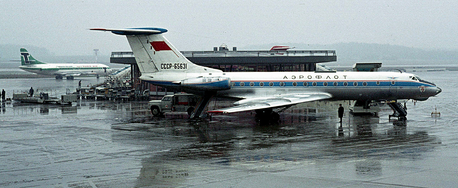 Tupolev Tu-134 CCCP-65631 of Aeroflot serviced at Geneva/Cointrin, Switzerland, on December 30, 1972. The Tupolev Tu-134 (NATO reporting name: “Crusty”), first flight in December, 1963, was a classic Soviet medium-range, “second generation”, jet airliner. The 50,7 kN (11.400 lb s.t., 5.170 kg s.t.) Soloviev D-30P turbofans were placed in rear-fuselage nacelles. The main four-wheeled undercarriages retracted into elongated fairings semi-recessed in the swept wings. The glass nose for the navigator was removed in the successive Tu-134A version. The normal passenger complement of the Tu-134 was 64 (16 first-class and 48 tourist), maximum 72, with a flight crew of three. It was mass manufactured for State airline Aeroflot and the East European airlines such as CSA (Czechoslovakia), LOT (Poland) and MALEV (Hungary). The aircraft in the picture - c/n 9350902 - was built in 1969 and served the Aeroflot international network till 1973, when it was transferred to Aeroflot’s North Kavkaz Division, based at Rostov. In 1984, CCCP-65631 was retired from active duty and put on static display in a park at Grozny (Tchechenia). It was later relocated at the Severny airfield. On December 1, 1994, the aircraft was badly damaged during an air raid by Russian Su-25 fighter-bombers. Individual aircraft info credit to Soviet Transports Database web-site http://www.scramble.nl/sovdb.htm. (Aeromedia)