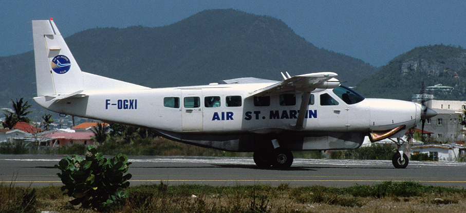 Cessna 208B Grand Caravan F-OGXI della Air Saint-Martin in rullaggio sulla pista dell'aeroporto di Juliana, situato nella parte olandese dell'isola caraibica di Sint Maarten. Il velivolo è equipaggiato con un contenitore per i bagagli installato sotto la fusoliera (foto Aeromedia)