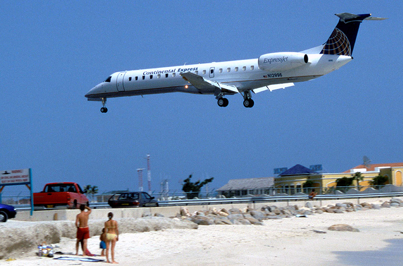 Embraer ERJ-145LR N12996 of Continental Express skims over the renowned beach of Maho Bay, seconds before its landing at Sint Maarten/Juliana airport (Caribbean Sea), August 2000. When the picture was taken, this aircraft - after the factory flights with provisional test marks PT-SKN - had been just delivered to the U.S. regional airline. (Aeromedia)