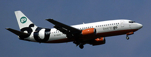Boeing B.737-36N G-IGOL della Go Fly in atterraggio a Milano/Malpensa, nella primavera 2000. (Aeromedia)