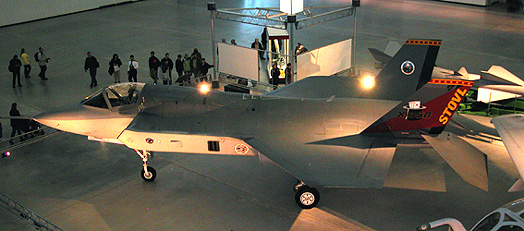 Lockheed Martin X-35B, Joint Strike Fighter STOVL demonstrator, on display at the Steven F. Udvar-Hazy Center near Washington, D.C., in December 2003. The X-35B was obtained after conversion from the X-35A, the CTOL variant demostrator which made its maiden flight on October 24, 2000. Both aircraft, powered by a 165 kN (approximate) thrust Pratt & Whitney F-119, have the same general dimensions: wing span 10.67 m (35 ft. 0 in.); overall lenght 15.52 m (50 ft. 11 in.); maximun take-off weight (approximate) 22,680 kg (50,000 lb.); maximum level speed Mach 1.6. (Aeromedia)