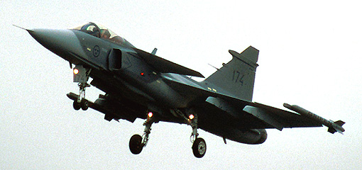 Saab JAS 39A Gripen "174" delle Forze Aeree Svedesi atterra al termine di un volo dimostrativo al salone Farnborough International 1990. Caccia leggero multiruolo per missioni di attacco al suolo, sul mare e ricognizione, il Gripen è stato sviluppato per sostituire progressivamente i JA 37 Viggen della SAF. Il primo prototipo ha volato per la prima volta il 9 dicembre 1988 ed il primo esemplare di serie è stato consegnato alle Forze Aeree Svedesi nel 1996. Il Gripen, propulso da un turbofan con postbruciatore RM12, versione locale del GE F404-400 prodotta dalla Volvo Flygmotor, equipaggerà 12 squadroni della SAF entro il 2007. Nel 1999 è giunto anche il primo ordine estero da parte delle Forze Aeree del Sud Africa.