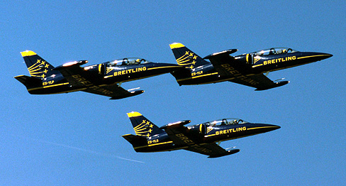 Una sezione di Aero L-39C Albatros della pattuglia acrobatica civile Breitling a Payerne (2004). (Aeromedia)