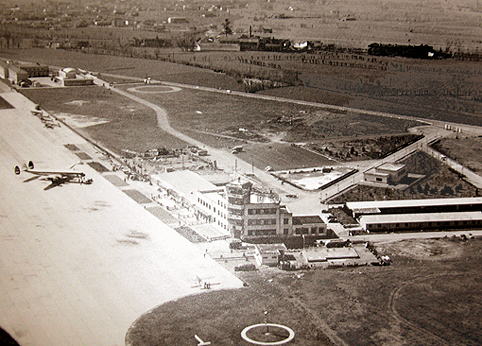 Turin/Caselle airport in the Fifties. The control tower with administrative buildings and the air terminal (center). Italian Air Force new facilities (top left). The intermediate undeveloped area was the location of the former Regia Aeronautica air base, destroyed by retiring German forces in 1945. On the apron there are three IAF’s Fiat G.59 trainers and a Beechcraft C-45 light transport aircraft, a Seaboard World Super Constellation and a Stinson L-5 light plane. (SAGAT)