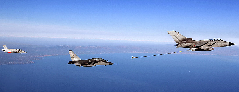 Le prove si sono svolte nel corso di due voli, con la collaborazione del Reparto Sperimentale Volo (RSV) dell’Aeronautica Militare. Il velivolo M-346, in configurazione con due serbatoi subalari da 580 lt, ha effettuato una serie di manovre di posizionamento in scia volte a verificare il comportamento vicino al velivolo rifornitore ed all’assieme tubo-cestello, valutando in particolare la regolarità e accuratezza dei dati aria (indicazioni di quota e velocità, angoli aerodinamici). Un velivolo MB-339CD, con equipaggio de Reparto Sperimentale Volo, ha seguito i voli di rifornimento con funzioni di photo-safety chase. (Alenia Aermacchi)