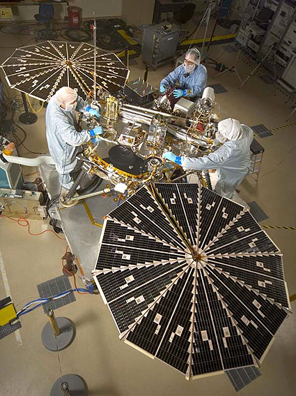Attività di integrazione della sonda Phoenix Mars Lander della NASA. Ben visibili i pannelli solari che forniranno l’energia durante l’attività sul suolo marziano. (Lockheed Martin)