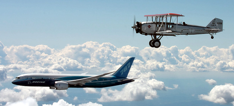 L’8 maggio scorso, nel cielo sopra Mount Rainer, a sud di Seattle, un nuovissimo B.787 Dreamliner ha incontrato un fantasma volante tra le nuvole. Si trattava di un biplano Boeing 40, l’antenato di tutta la dinastia di aeroplani commerciali del costruttore USA.